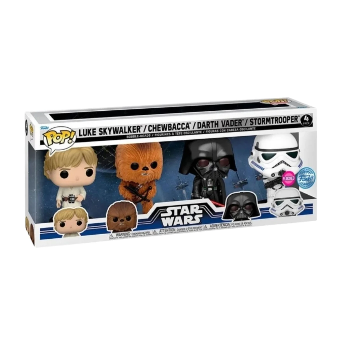 Cada Funko de este set refleja de manera excepcional la esencia de los protagonistas de la saga. Luke Skywalker aparece con su inconfundible atuendo de Jedi, listo para enfrentarse a los retos de la galaxia. Chewbacca, gracias al acabado Flocked, se siente más realista que nunca, evocando su pelaje característico. Darth Vader, con su imponente armadura, transmite toda la fuerza del Lado Oscuro, mientras que el Stormtrooper aporta el toque clásico que nunca puede faltar en cualquier colección dedicada a Star Wars. En conjunto, el diseño de este pack consigue equilibrar héroes y villanos, logrando una presentación que impacta tanto en detalle como en estilo.