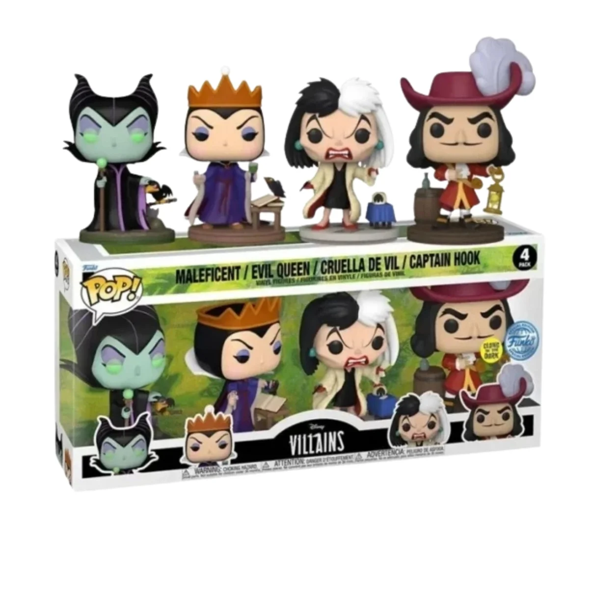 El Funko 4 Pack Villains reúne a cuatro de los antagonistas más memorables de Disney en una sola edición exclusiva. En este pack se incluyen a Maleficent, Evil Queen, Cruella de Vil y Captain Hook, personajes que, a lo largo de los años, se han convertido en símbolos de maldad, ingenio y carisma en la cultura popular. Además, este set presenta la edición especial Glow in the Dark (GITD), lo que significa que brillan en la oscuridad, aportando un detalle único y mágico a tu colección.
