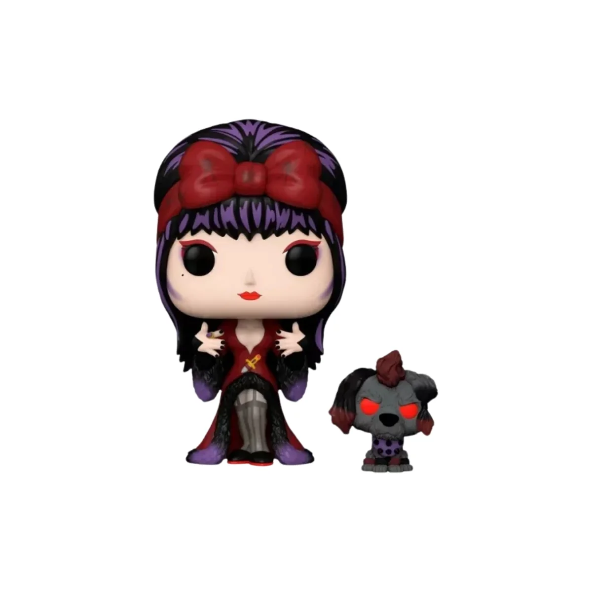 Este dúo es una oda a la cultura pop, al horror con sentido del humor y a esa mezcla única de elegancia y desparpajo que solo Elvira puede lograr. Si eres fan del personaje o un coleccionista que busca joyas únicas, esta figura es imprescindible.