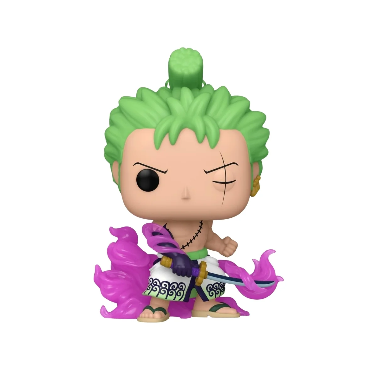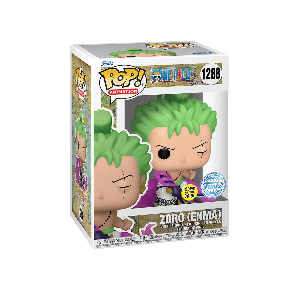 Funko Zoro One Piece. El espadachín más temido del East Blue regresa en una de sus versiones más imponentes: Zoro Enma – Funko POP! #1288 Glow in the Dark. Inspirado en uno de los momentos más impactantes del arco de Wano, este Zoro porta la legendaria espada Enma, una de las 21 espadas de grado supremo, con todo el poder y aura que la caracteriza.