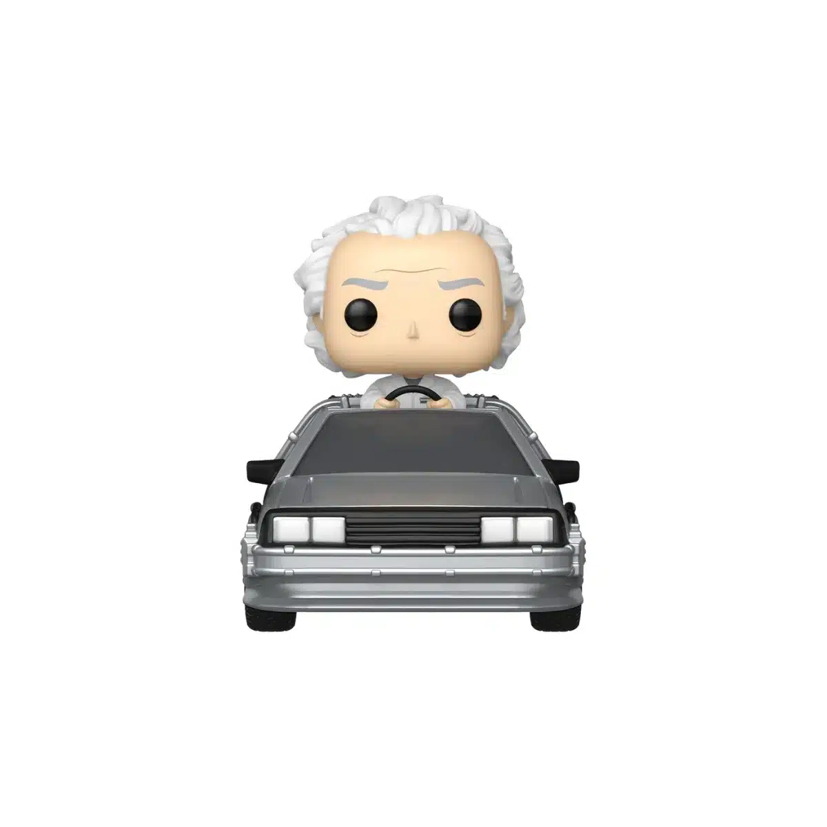 Desde el primer vistazo, este Funko impresiona. No solo por la figura de Doc, con su característica melena blanca, sus gafas y su inconfundible vestimenta, sino porque viene acompañado del vehículo más famoso del cine: el DeLorean modificado para viajar por el tiempo. Cada detalle del coche está recreado con precisión, desde el condensador de flujo hasta las puertas de ala de gaviota. Incluso los acabados metálicos y las ruedas plegadas, listas para despegar, hacen que esta figura destaque entre cualquier colección.