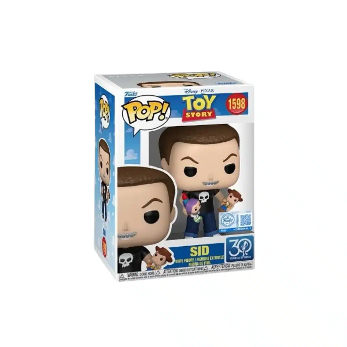 El diseño de este Funko Pop de Sid 1598 SE captura su camiseta con calavera y su actitud característica, respetando la estética original del personaje en Toy Story.