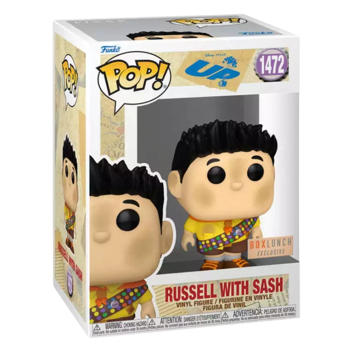 - Diseño y presentación. Este Funko Pop de Russell With Sash está fabricado en vinilo de alta calidad y se presenta en una caja expositora con ventana frontal.